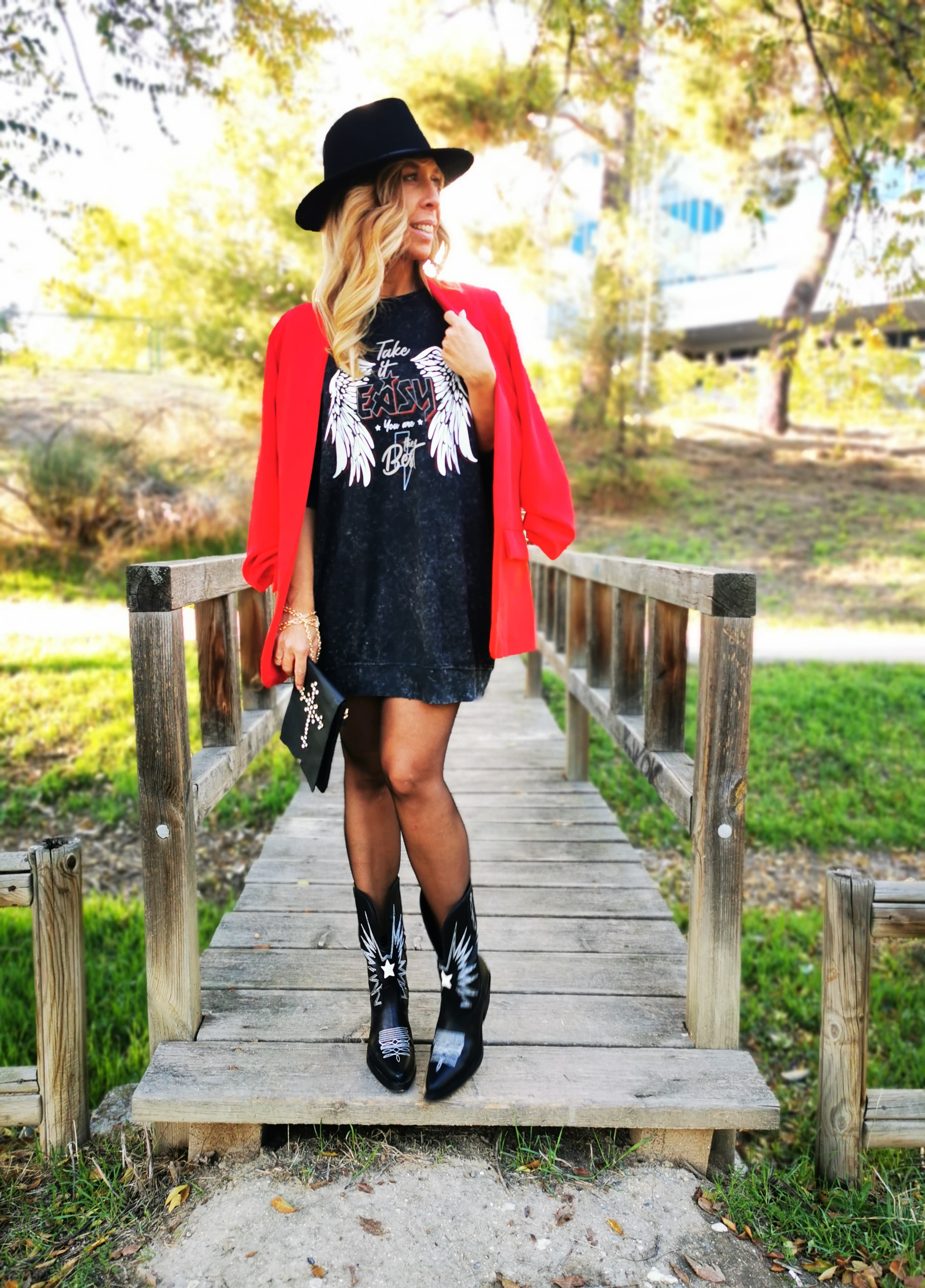 - Y para las amantes de los vestidos la bota cowboy es una compañera ideal. Pudiendo ser vestidos por encima de la rodilla, o un poco más largo, además quedan ideales tanto si el vestido es de vuelo como si recto. Le darán un toque ÚNICO a tu look.