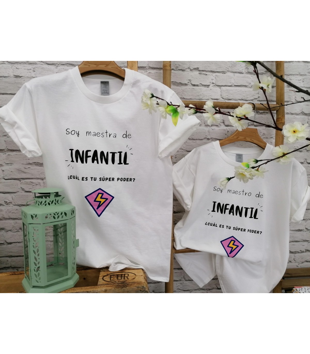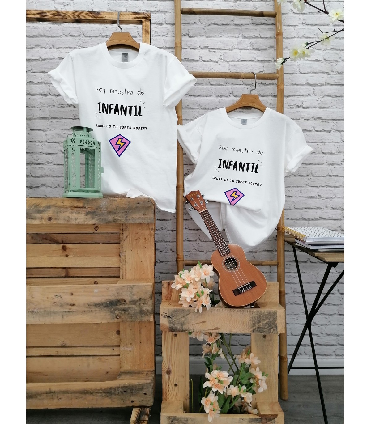 Camiseta básica de corte recto, cuello redondo y manga corta, con detalle frase y dibujo dedicado a maestros de la educación.