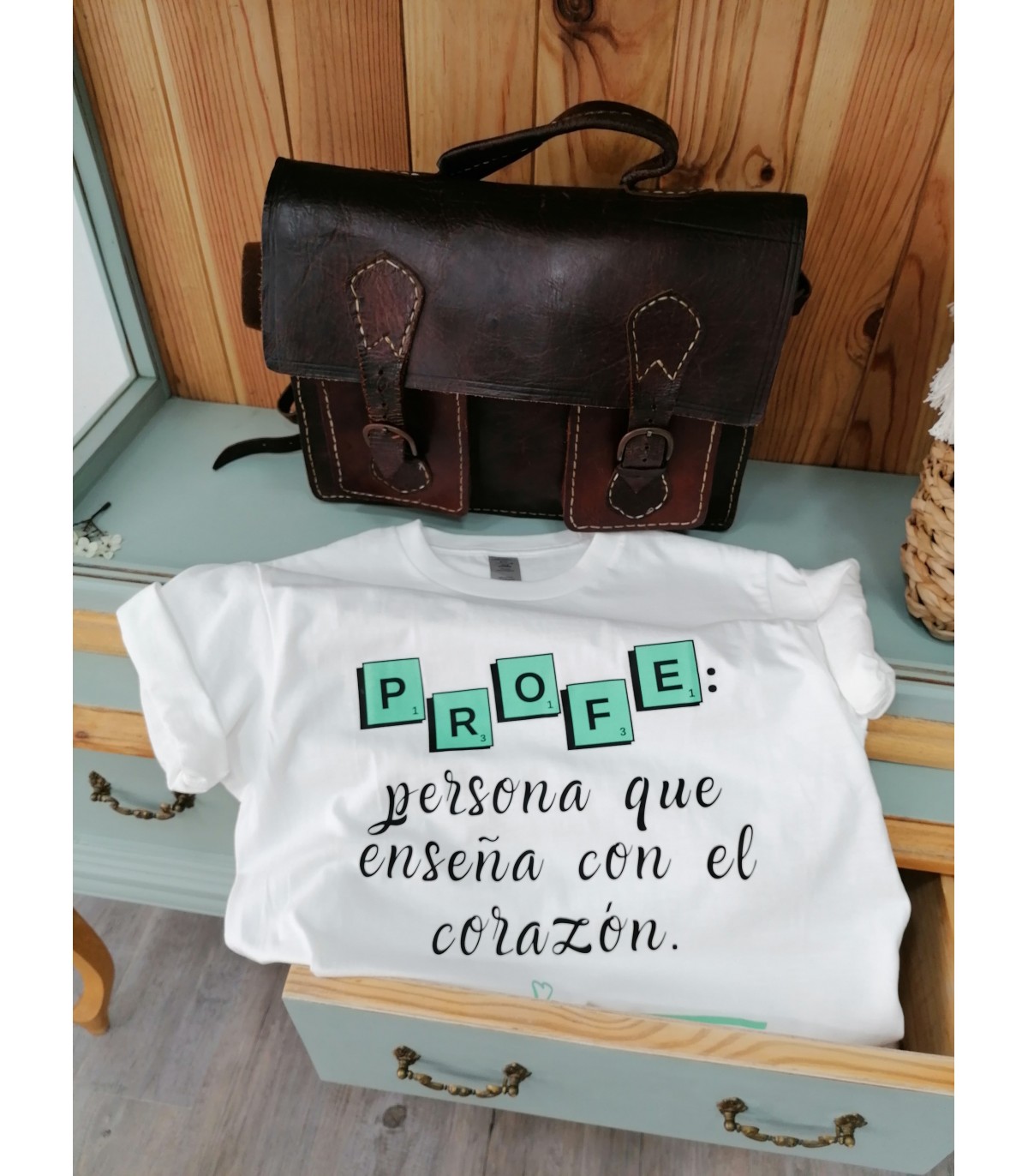 Camiseta básica de corte recto, cuello redondo y manga corta, con detalle frase y dibujo dedicado a maestros de la educación.