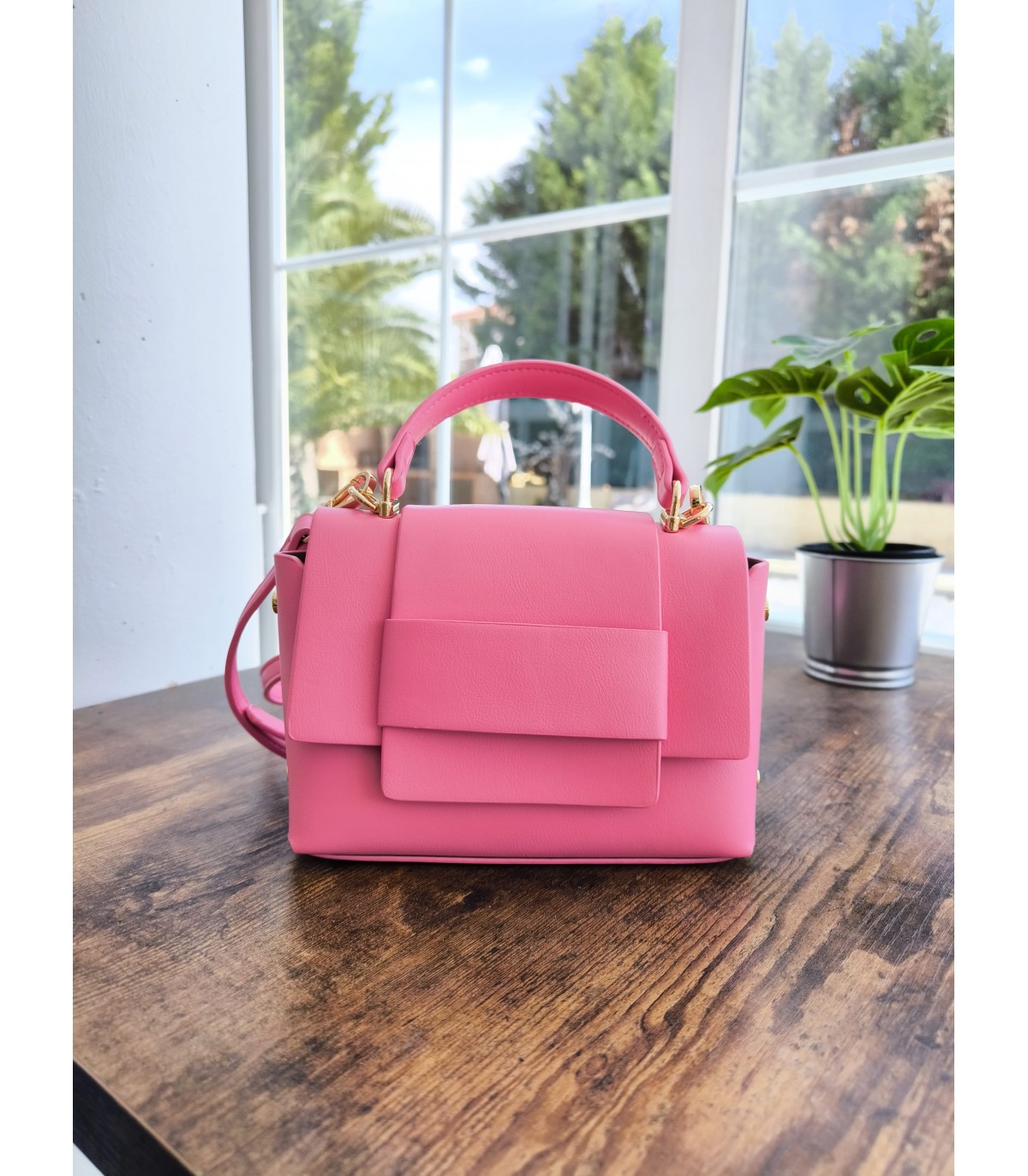 Bolso de polipiel pequeño con forma cuadrada y solapa, detalle tachuelas en dorado.