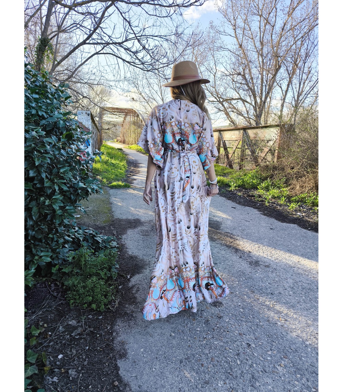 Vestido largo rasete tipo vaporoso, corte imperio debajo del pecho con manga murciélago escote en pico y de talla abertura debajo del pecho con lazo, espalda abierta con botones, color beige con diversos estampados tanto la parte de arriba como la parte de la falda.