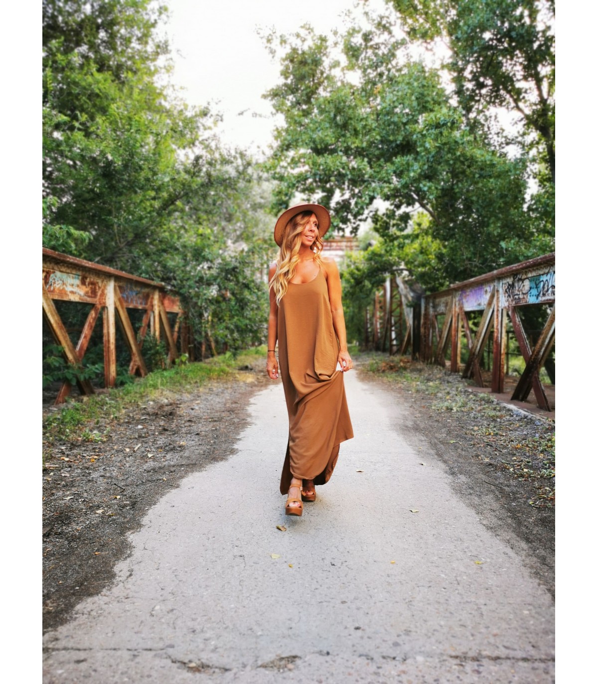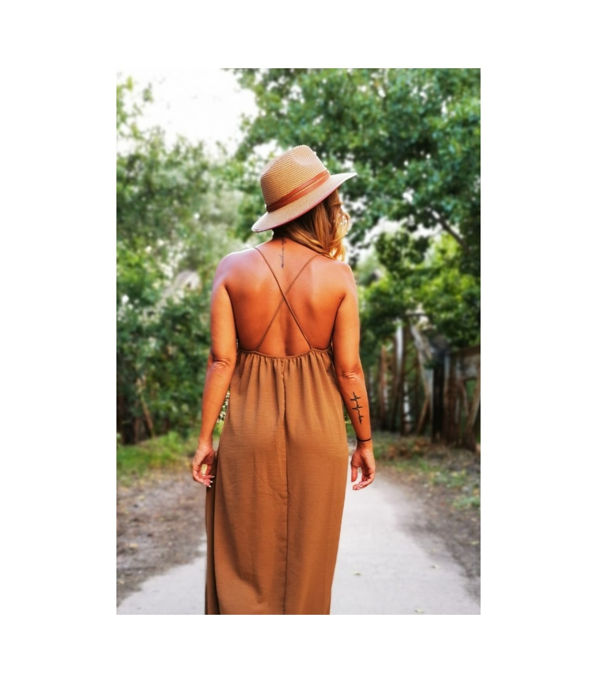 Vestido de tela vaporosa con aberturas a los lados escote redondo y tirante de goma con espalda escotada.
